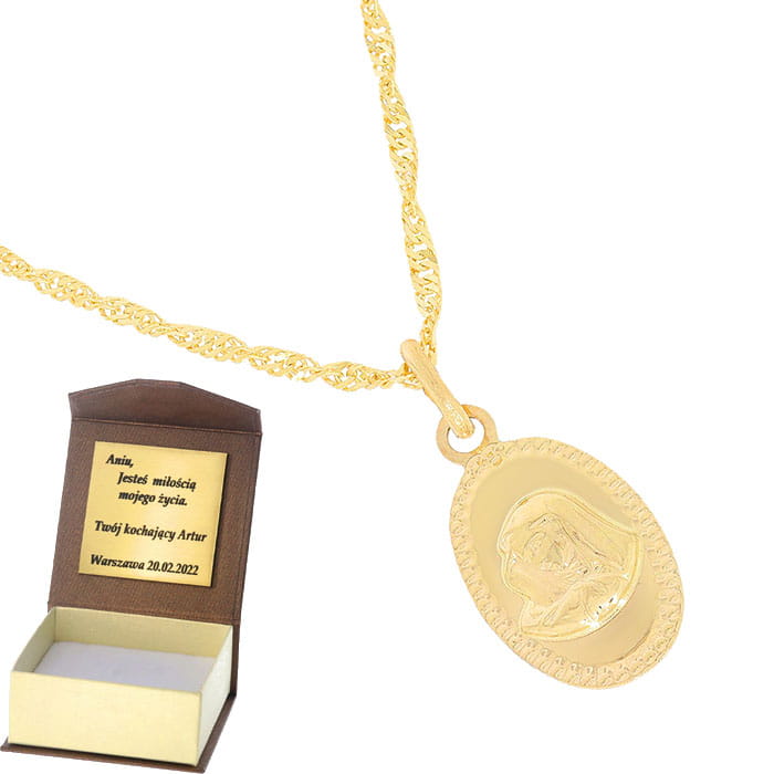 Do przedstawionego medalika proponujemy bardzo szeroki wybór łańcuszków doskonale pasujących jako komplet. Zależnie od Twoich potrzeb możesz zakupić jedynie medalik lub dobrać łańcuszek według własnego gustu. W przypadku wątpliwości służymy fachowym doradztwem