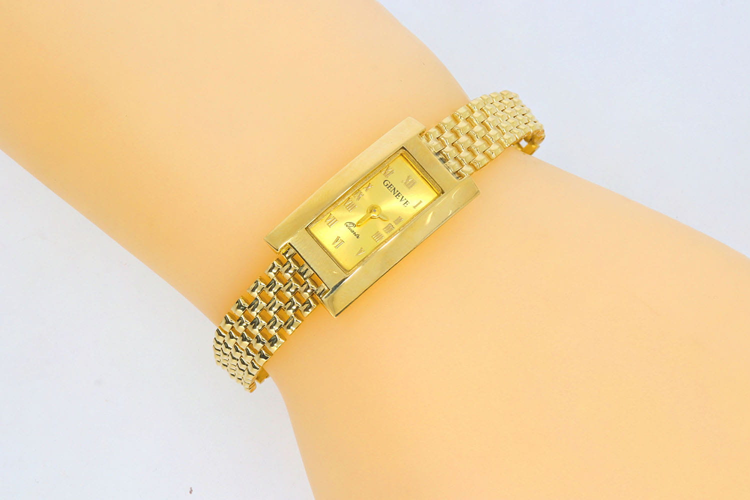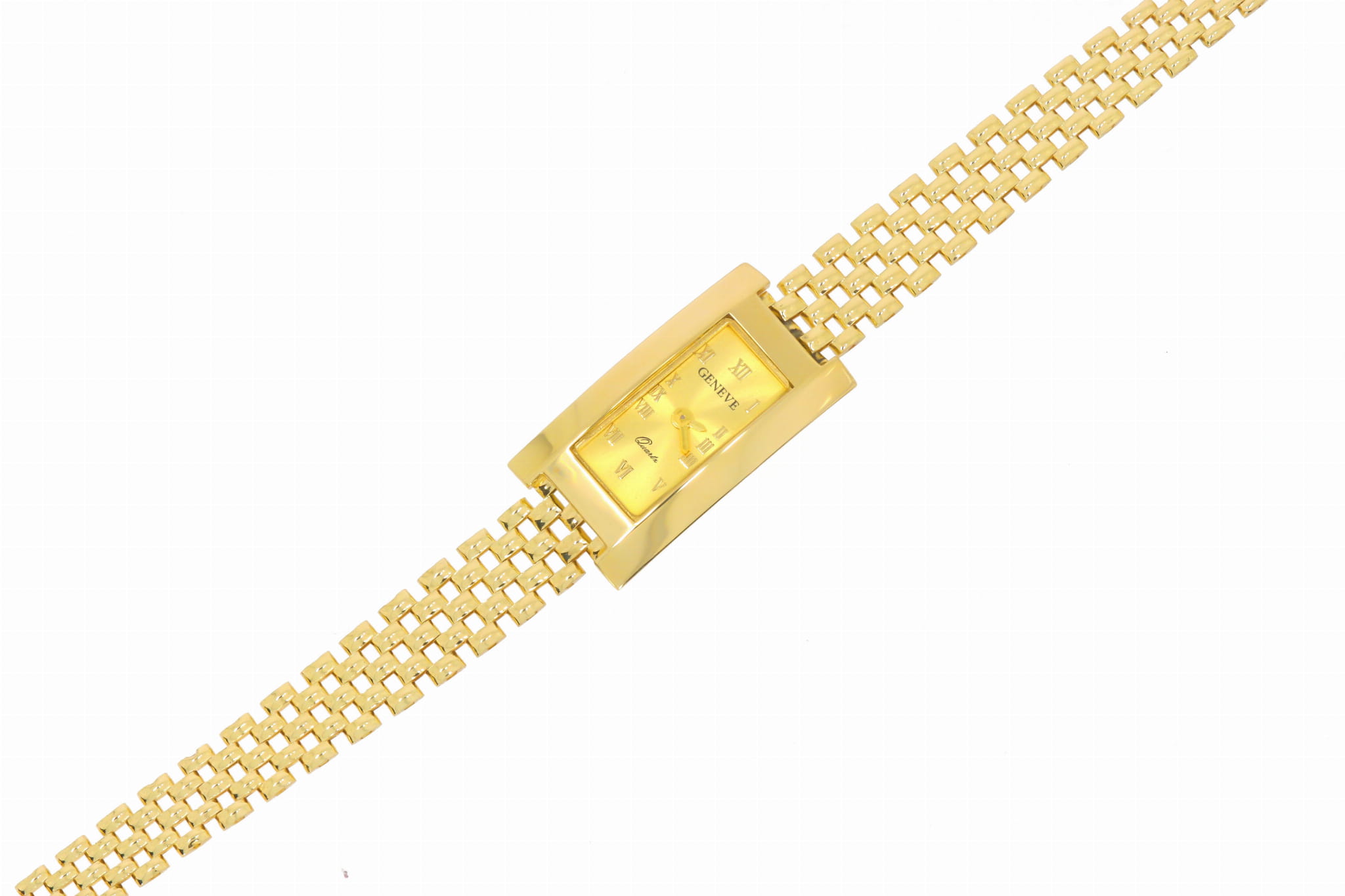 Złoty zegarek Geneve przedstawiony w naszej ofercie został wykonany z wysokiej jakości złota próby 585. Biżuteria została stworzona z pasją i wielką precyzją, aby zapewnić komfort jej użytkowania.