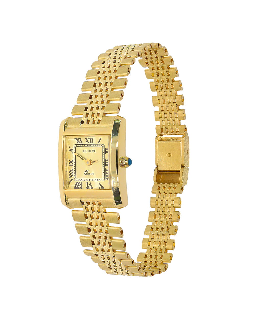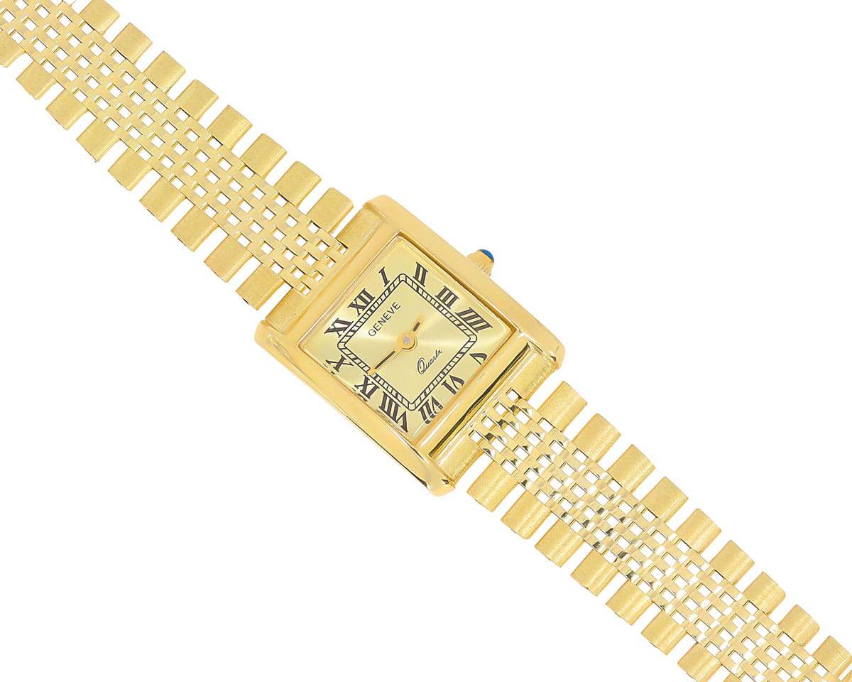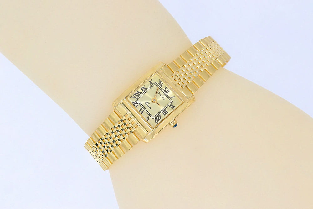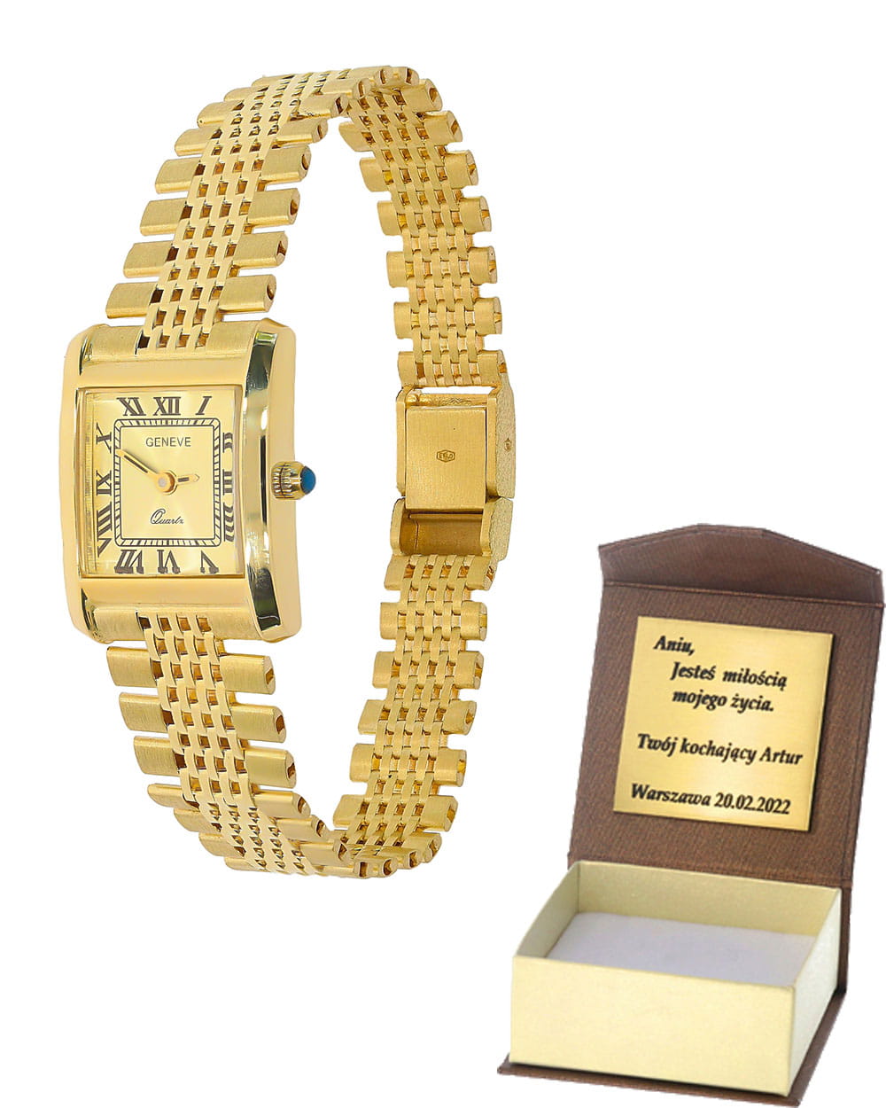 Złoty zegarek Geneve przedstawiony w naszej ofercie został wykonany z wysokiej jakości złota próby 585. Biżuteria została stworzona z pasją i wielką precyzją, aby zapewnić komfort jej użytkowania.